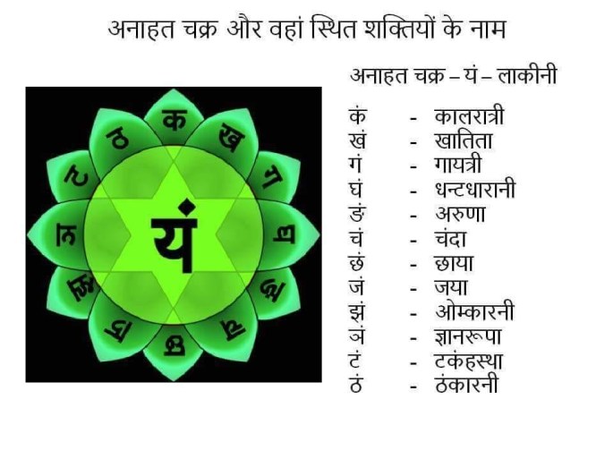 हृदय स्थल में स्थित हरितवर्ण का द्वादश दल कमल की पंखुड़ियों से युक्त द्वादश अक्षरों से सुशोभित चक्र ही “अनाहत चक्र” है।