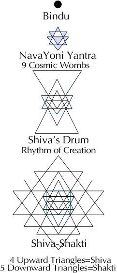 श्रीयंत्र में सर्वप्रथम धुरी में एक बिन्दु और चारो तरफ त्रिकोण है, इसमें पांच त्रिकोण बाहरी और झुकते है जो शक्ति का प्रदर्शन करते हैं और चार ऊपर की तरफ त्रिकोण है, इसमें पांच त्रिकोण बाहरी और झुकते हैं जो शक्ति का प्रदर्शन करते है और चार ऊपर की तरफ शिव ती तरफ दर्शाते है। अन्दर की तरफ झुके पांच-पांच तत्व, पांच संवेदनाएँ, पांच अवयव, तंत्र और पांच जन्म बताते है।